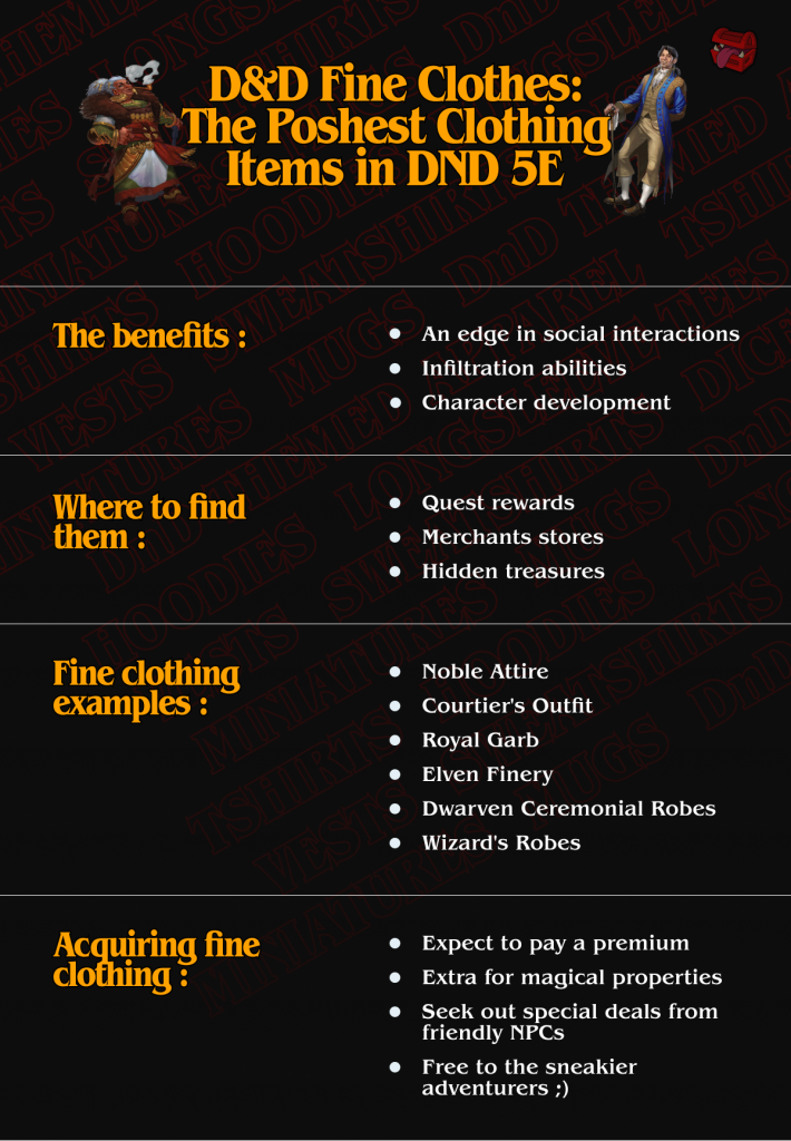 D&D Fine clothes play a crucial role in how characters are perceived by NPCs and other players. A character dressed in lavish attire is more likely to command respect and admiration, while also attracting attention, both positive and negative. Mechanically, fine clothes can provide bonuses to charisma-based checks, such as persuasion, deception, and intimidation, reflecting the confidence and charm of a well-dressed individual.