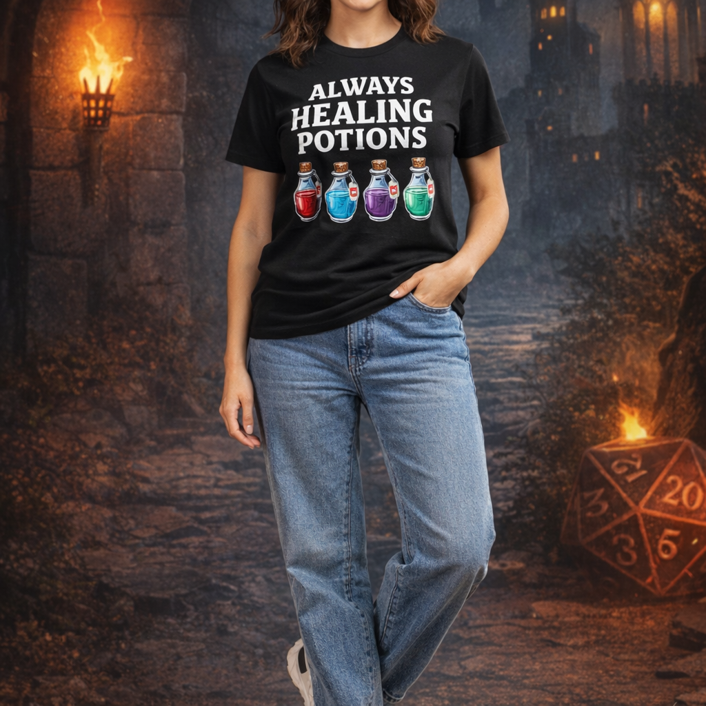 Our “Always Healing Potions” tee is a modern graphic T-shirt you can wear on any quest – everyday style, adventurer attitude!